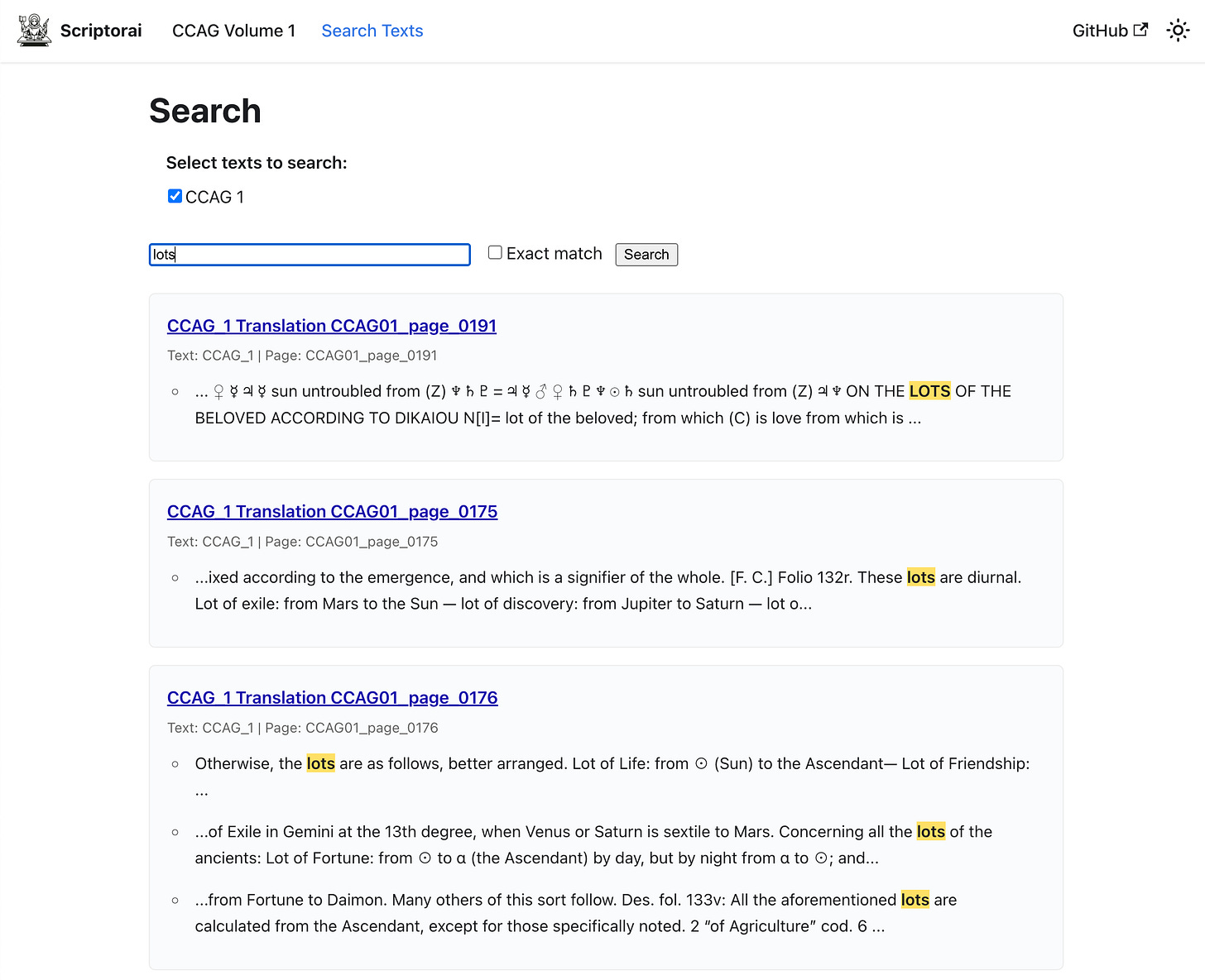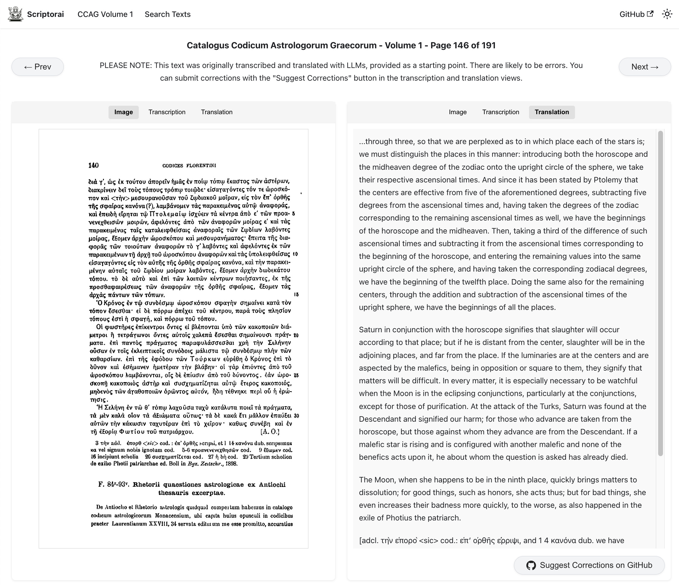 I have built a site called Scriptorai, a website hosting the first volume of CCAG. It has a doubled side-by-side view of the image, transcription, or translation so you can inspect it yourself, and anyone with a GitHub account can suggest corrections. There is also full-text search, so you can search the entire book for specific terms. (Also, you can flip pages with the left and right arrow keys, which I personally think is a nice touch.) The transcription and translation data are stored separately from the site in a GitHub repository, at sadalsvvd/scriptorai-ccag-01, so suggestions there will automatically show up on the website. If this is a project that people interested in, over time we can crowd-translate a high-quality version of this and other texts, and build more sophisticated collaboration tools. As the original CCAG volumes are in the public domain, I have also added a public domain license to the CCAG repository, and permissive MIT licenses to the source code to the Scriptorai site itself at sadalsvvd/scriptorai, and hemiplon, the tool for transcribing/translating PDFs at sadalsvvd/hemiplon. This means that you can also use this tool to do first-pass translations of your own texts, and view them locally with the site.2